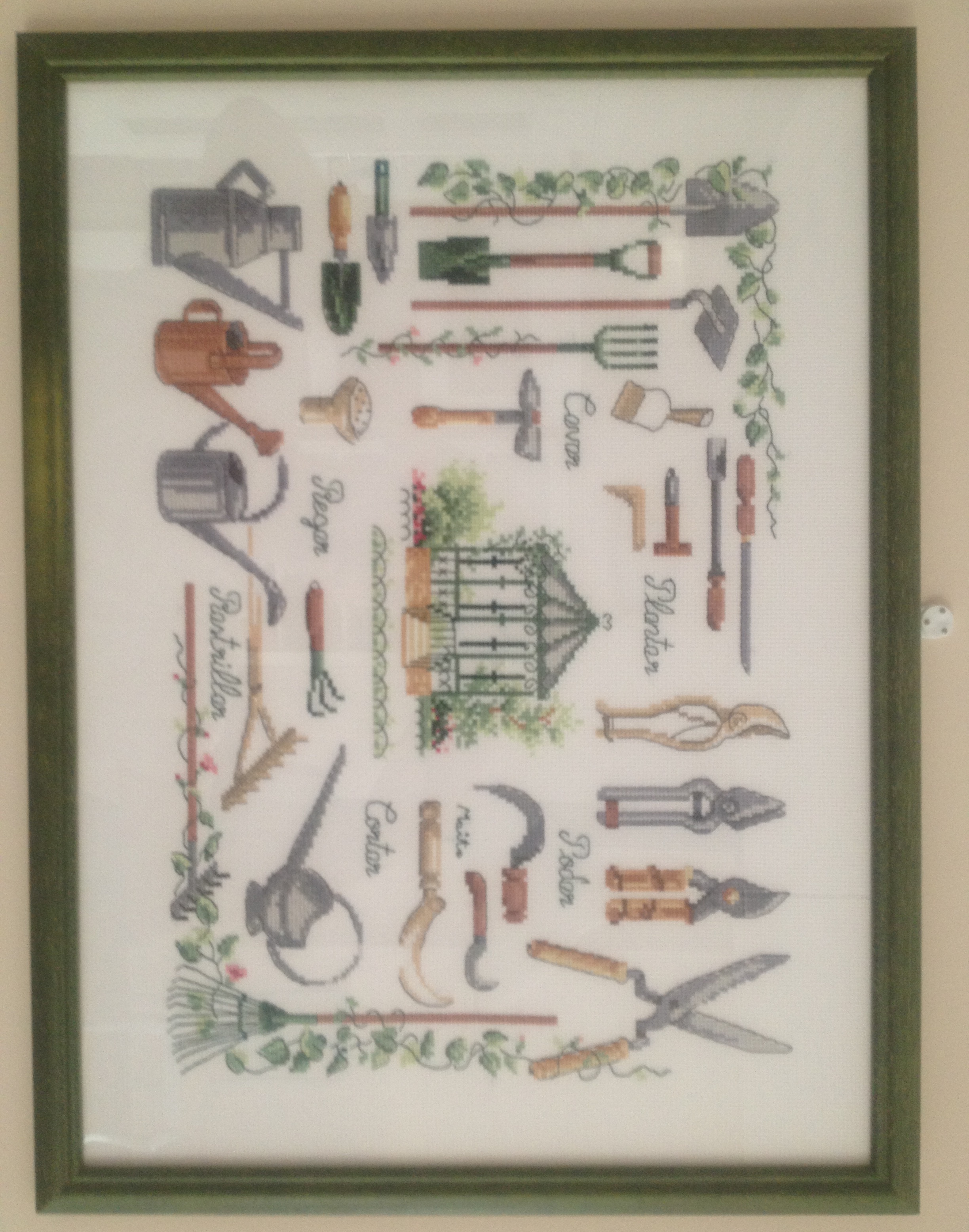 Este bonito cuadro de herramientas del huerto y el jardín resulta muy atractivo para una casa de campo. Por su tamaño y el número de motivos puede requerir incluso una semana de trabajo, dependiendo de la experiencia de la artista. El dibujo está tomado de la revista «Labores de Ana». El gráfico te permite realizar varias combinaciones con todos los motivos que aparecen, y que luego puedes utilizar para realizar motivos pequeños. El marco de color verde con formas redondeadas acentúa el tono clásico y contribuye a resaltar el conjunto.