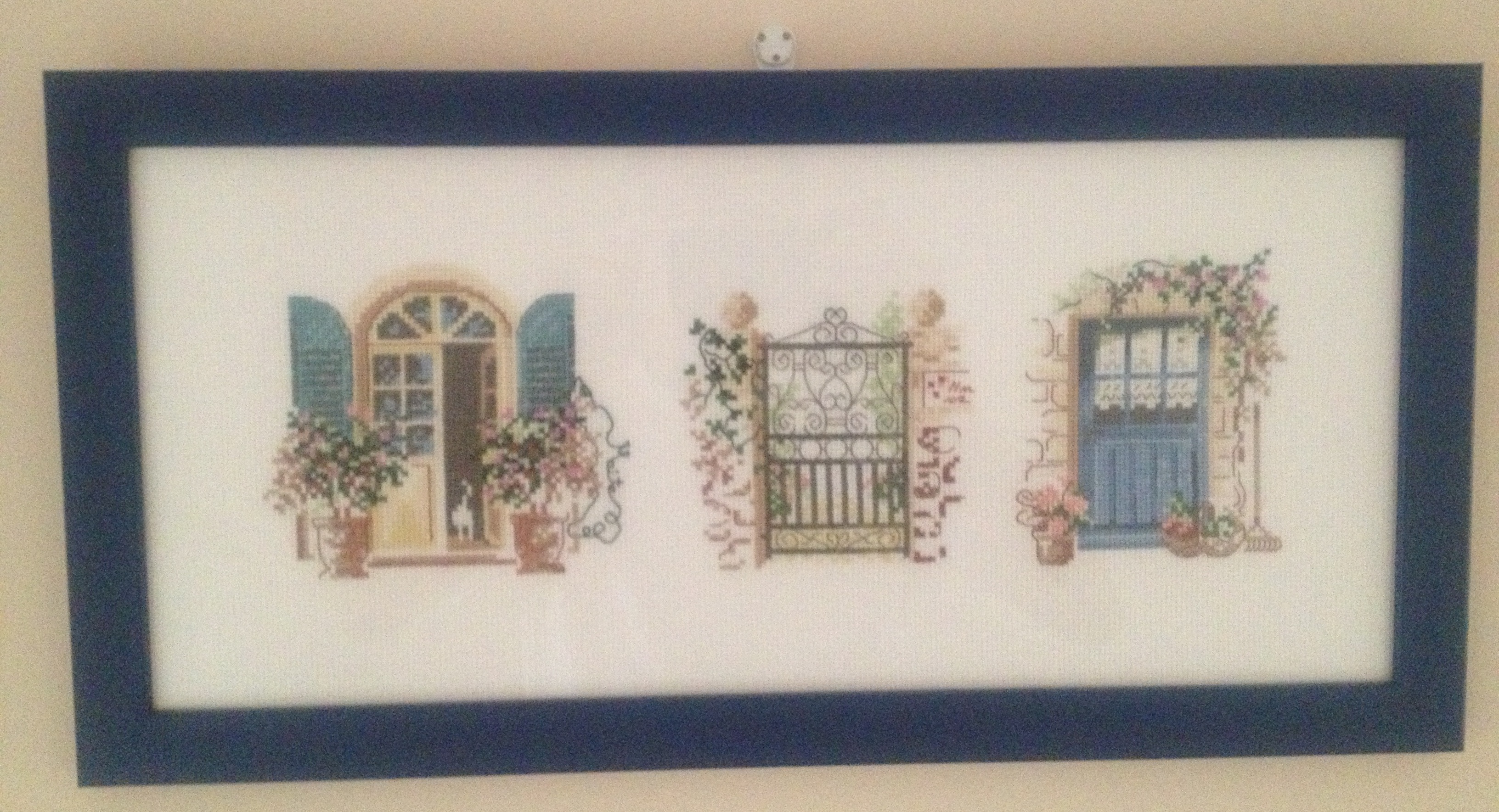 Esta composición de tres puertas la saqué de la revista ‘Labores de Ana’ en mayo de 2012. Las tres puertas en tonos azules destacan sobre el fondo blanco, y el marco ancho del mismo tono resalta aun más el conjunto. Este cuadro está puesto en un pasillo de una casa de campo decorando una zona de paso.