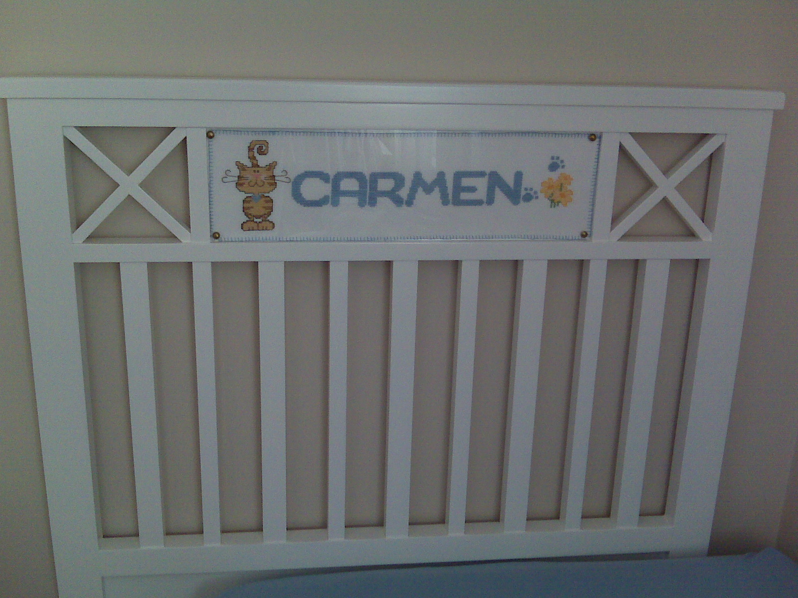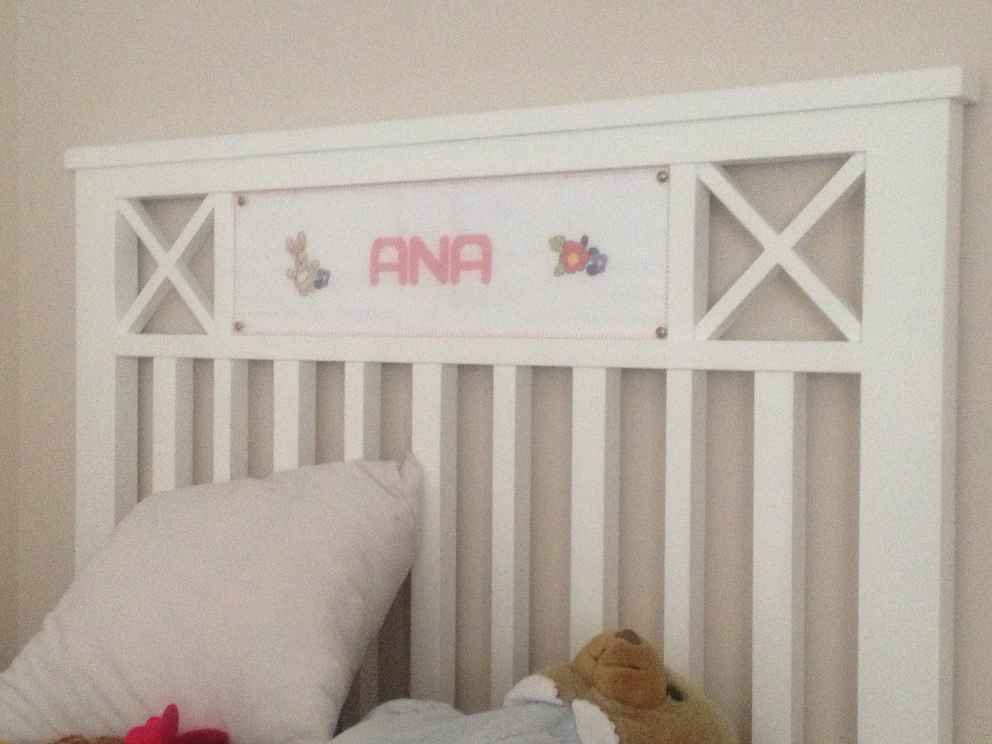 Hemos confeccionado dos trozos de tela, ribeteados a mano con festón, y en ellos hemos elegido como motivos el nombre de las niñas y algún otro dibujo o detalle que lo adorne. Luego insertamos la tela en el hueco de los cabeceros de cama, cortamos un plástico transparente o vinilo a su medida. Finalmente lo fijamos con unas chinchetas de las que se usan en tapicería. ¡El resultado es espectacular!