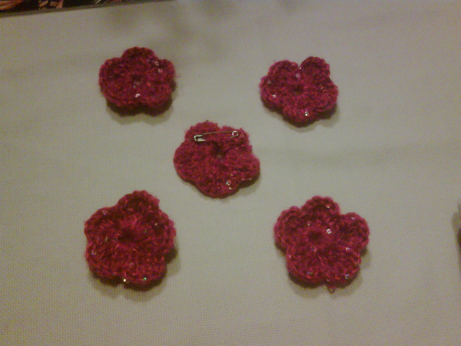 Encontré esta lana con pequeñas lentejuelas muy barata (2 euros el ovillo de 50 gramos) y he hecho estas florecitas, a las que he cosido un imperdible por detrás, para usarlas como broche. Las podéis aplicar también en otras labores (gorros, bufandas, etc).