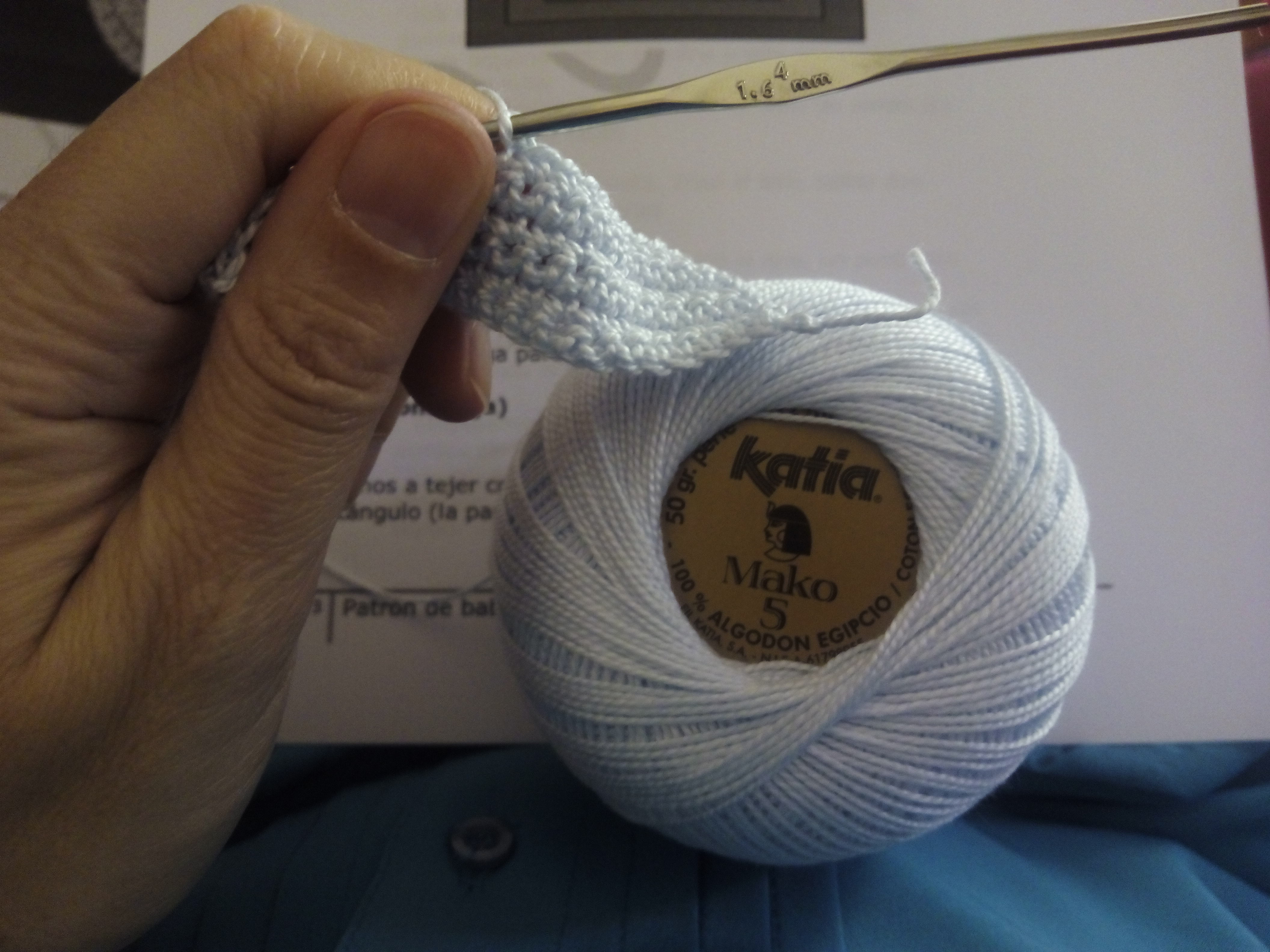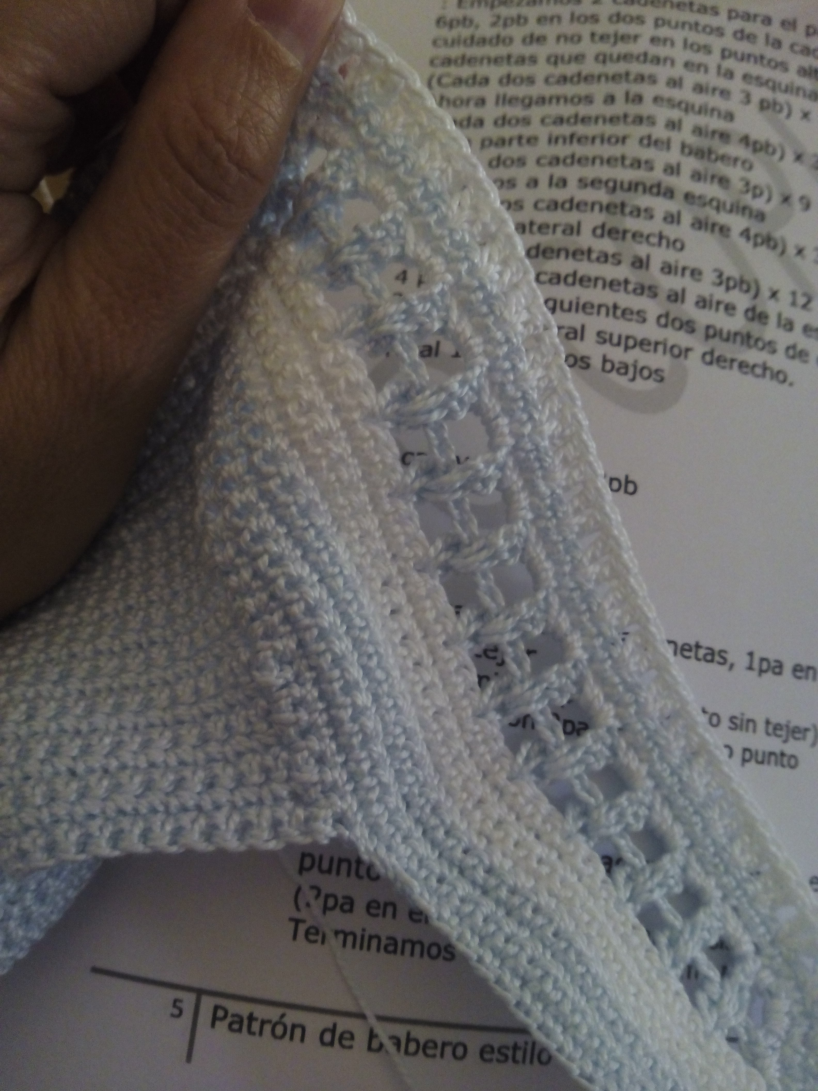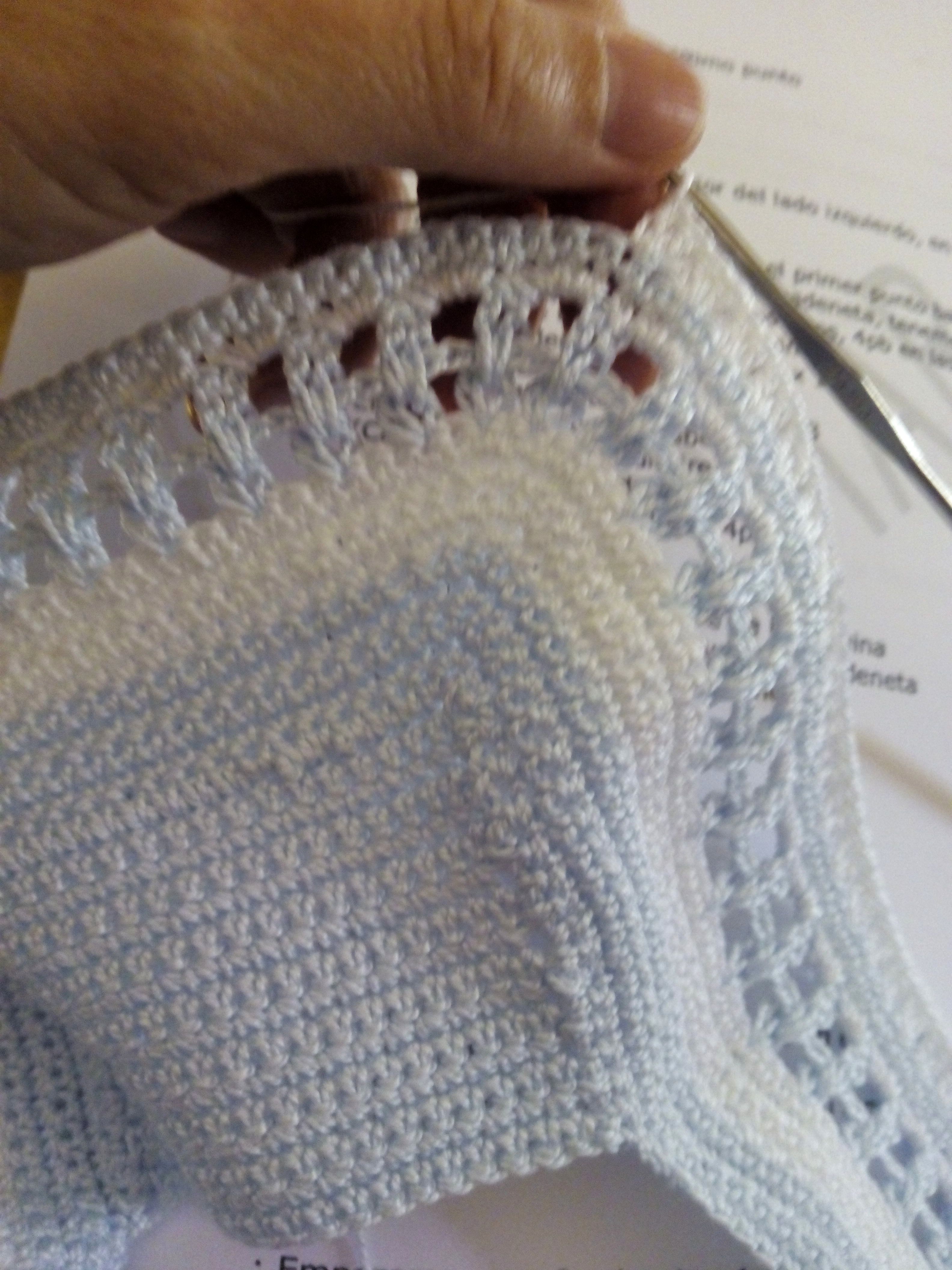 Seguimos tejiendo, alternando el color celeste y el blanco en las vueltas caladas.