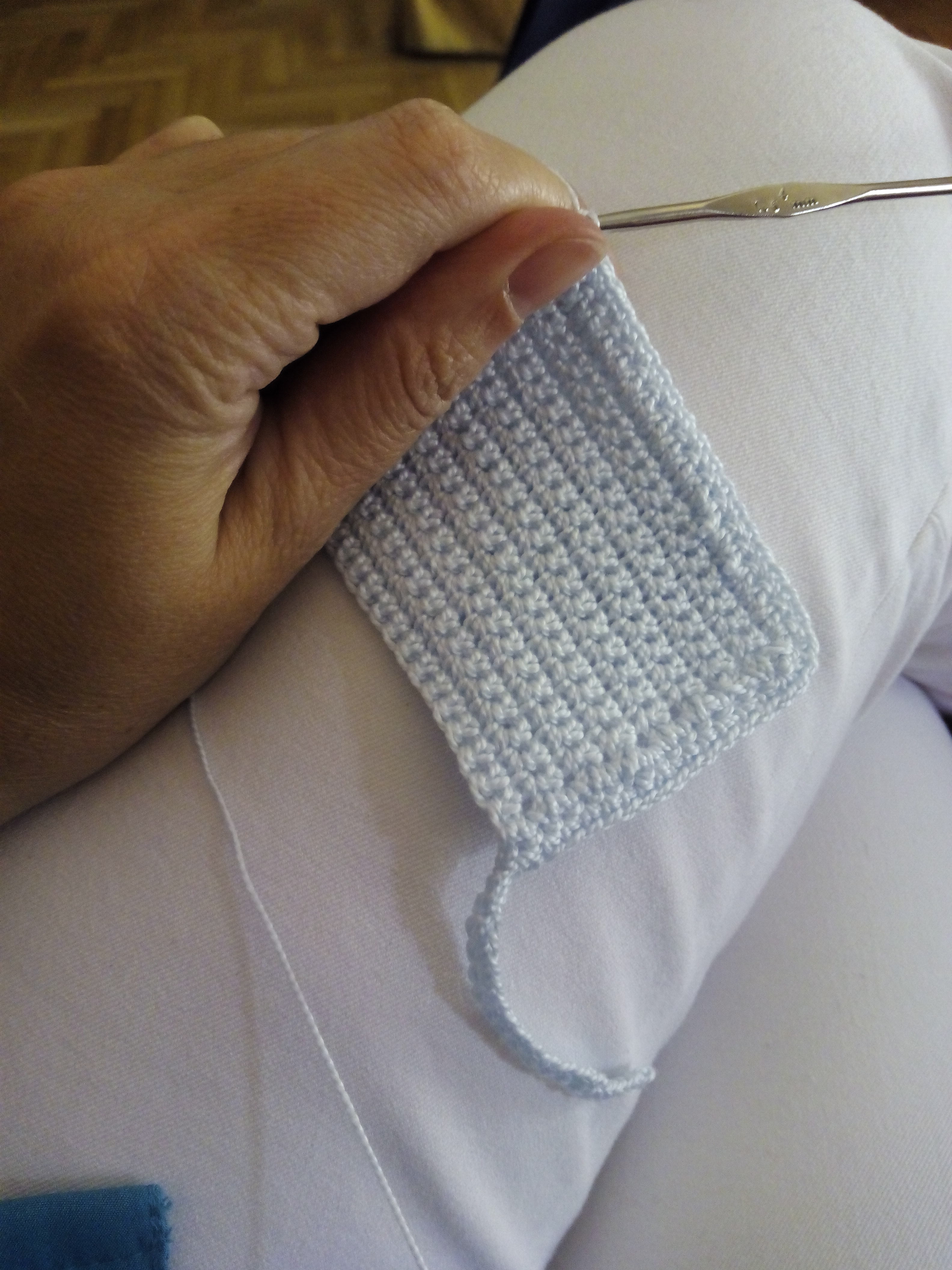 We continue by crocheting, alternating the blue-sky and the white shades in the lace rows.