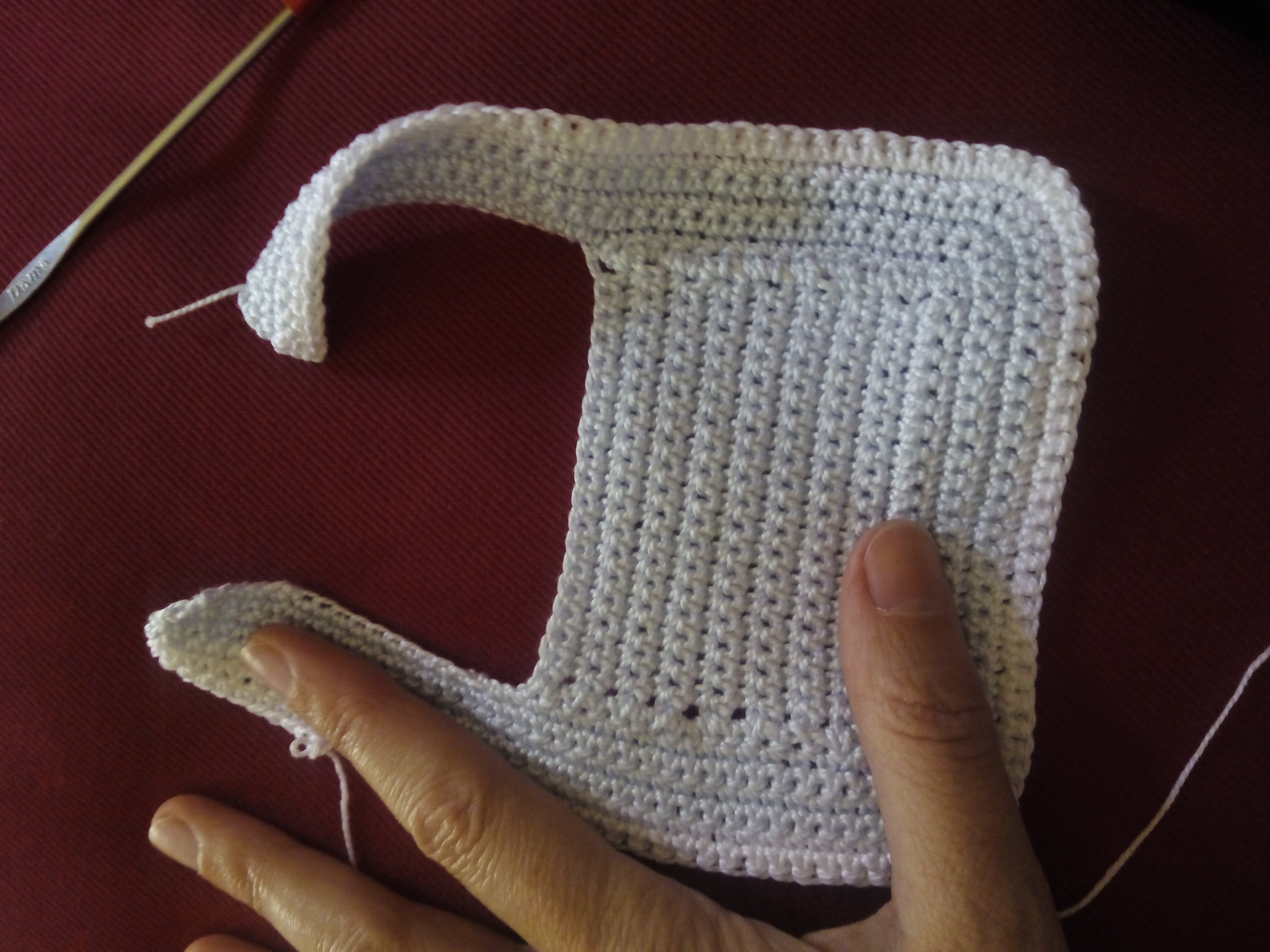 Empezamos tejiendo el rectágulo central, lo rematamos y seguimos con la parte lateral que unimos al centro.