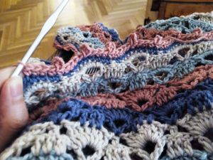 Continuing with last week post, despite the hot weather we are suffering, today’s publication is about a shawl made with leftover yarn from Marcos’ blanket. I gave it to his mother to wear it matching her baby.