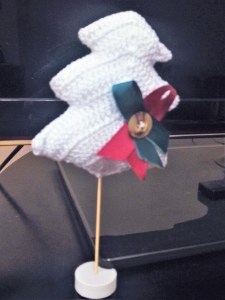 Por último, le cosemos el palito de madera con su peana que hará de base para que nuestro árbol de navidad se sostenga. Para darle un toque colorido, lo adornamos con unos lazos y un botón que cosemos a nuestro arbolito.