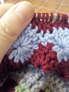 And here you are, the first rows with DC, granny stripes and the beginning of the Catherine’s wheels: