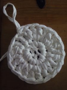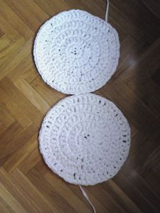 We shall need two big cotton yarn balls at least. It should be better if the cotton yarn is mixed with a little bit of elastic fibre, because it’s easy to crochet it. The cotton balls are very cheap (you can find them in an «Asia Market» type store for less than two euros each). The pattern is quite simple; you have to crochet two circles of the same size, using double crochet points, until you reach the size you want.