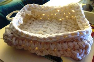 As you know, at home we use every leftover of yarn, so we did this small basket to put things in it. You can use it as a bread basket or to organise wardrobes, shelves, etc.