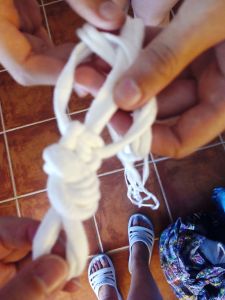 Finalmente, para confeccionar el asa, hicimos una tira con nudos de macramé, que posteriormente unimos a los dos extremos del bolso. En este paso me ayudó mi hija pequeña.