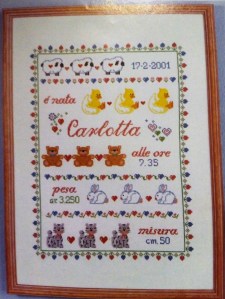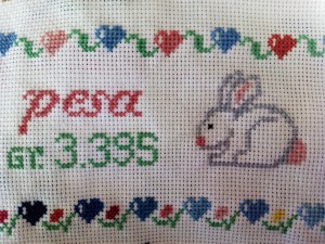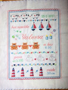 It was the typical childbirth cross stitch picture from «Labores del Hogar» magazine and the entry was 16 years old…you can really see how time passes…